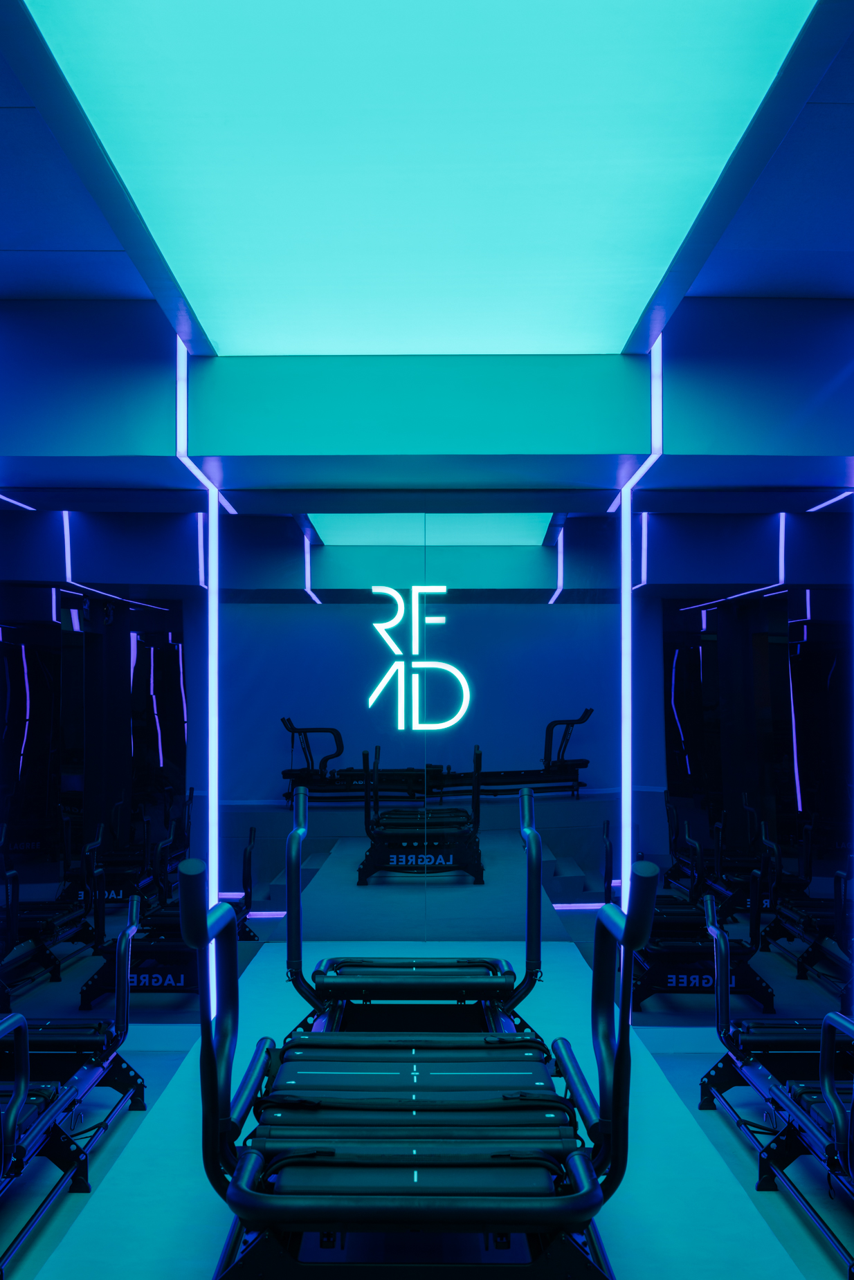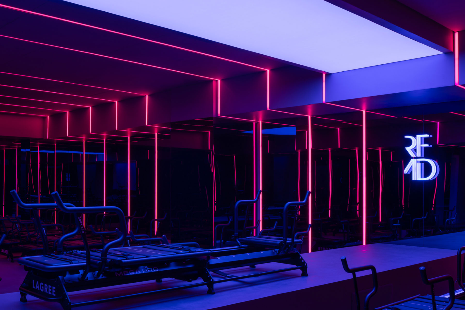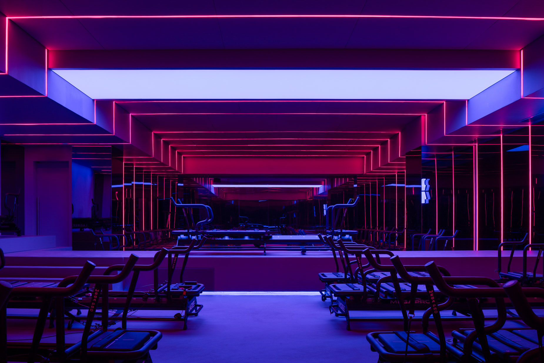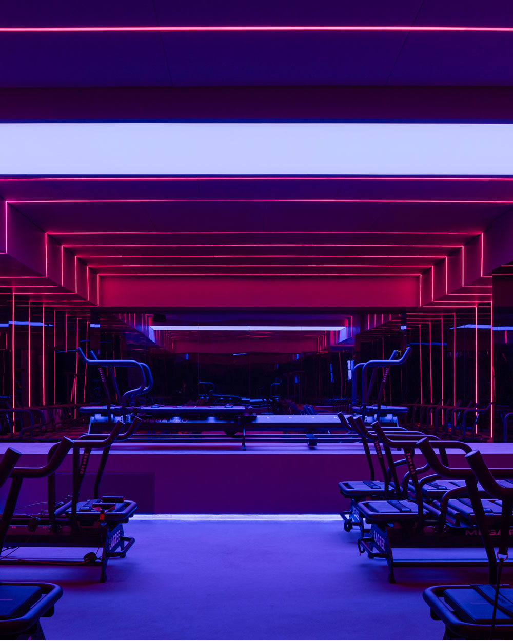 The studio features thirty Megaformers flanking a central platform that elevates the instructor as both guide and stage performer. Neutral-toned surfaces set the stage for fully integrated chromatic lighting and audio systems tuned not just to volume and colour, but to stamina, recovery, and focus.