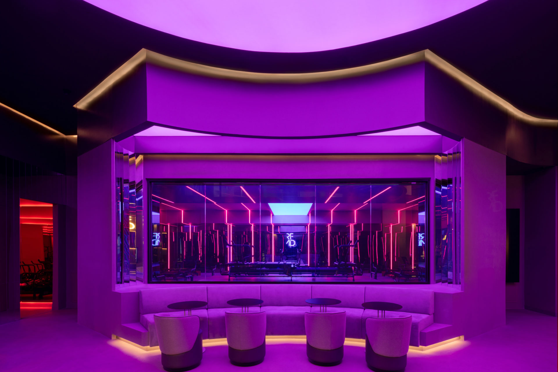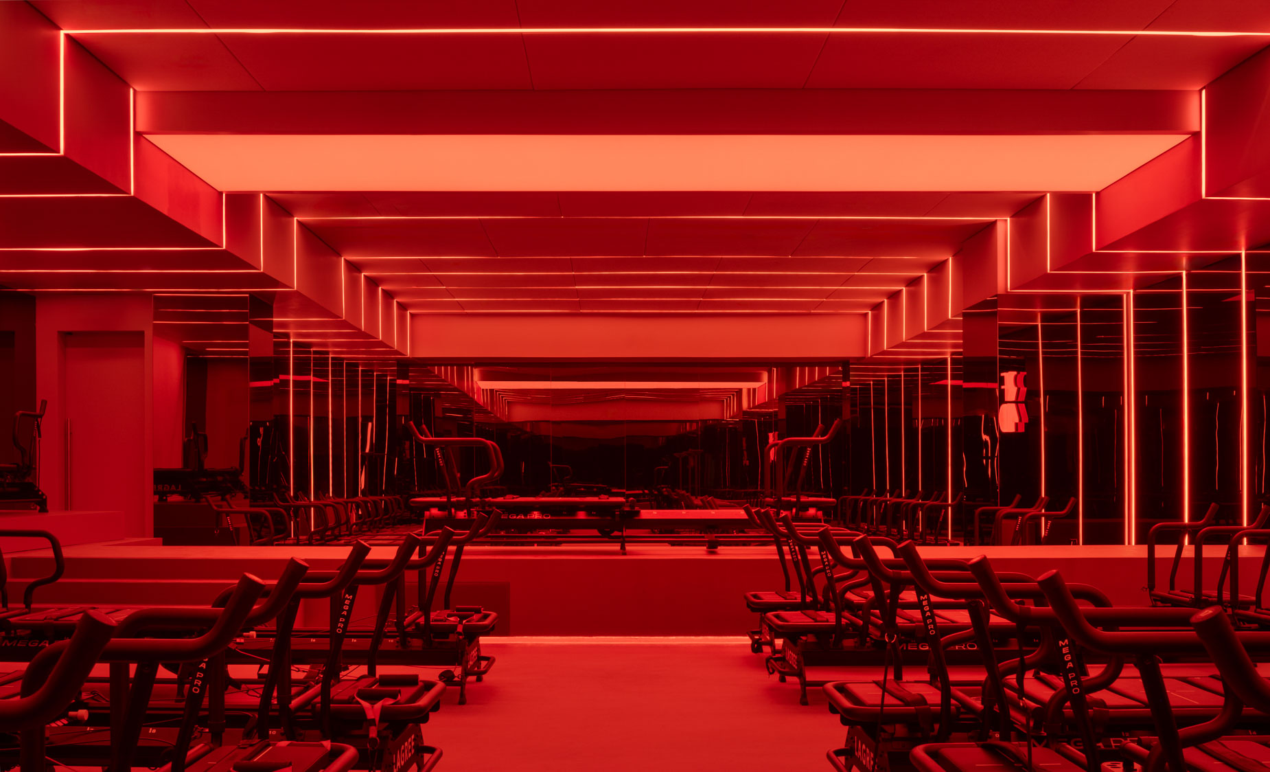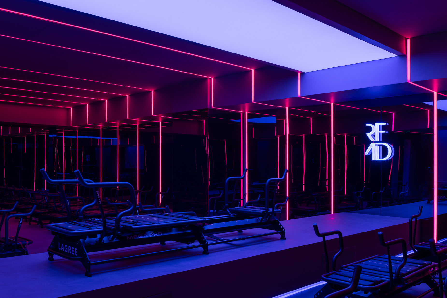 The studio features thirty Megaformers flanking a central platform that elevates the instructor as both guide and stage performer. Neutral-toned surfaces set the stage for fully integrated chromatic lighting and audio systems tuned not just to volume and colour, but to stamina, recovery, and focus.